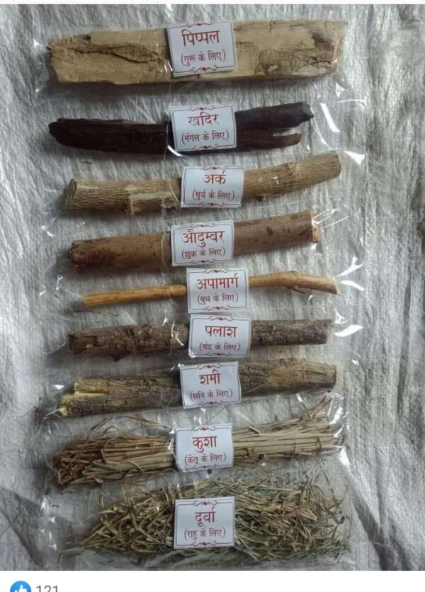 इस किट में नवग्रह समिधा की नो प्रकार की लकडि़यांं सामिल है जो कि नवग्रह समिधा हवन के लिए उपयुक्त हैं