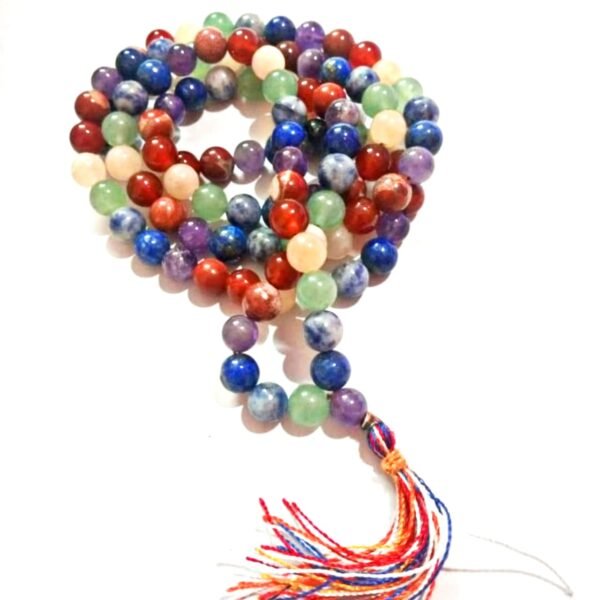 यह माला सात अलग अलग प्रकार के रत्नों से मिलकर बनी एक सुन्दर ओरिजिनल सात चक्र माला है जो की 7 से 8 एम एम के बीच की साइज़ की है। हमारे शरीर के सतो चक्रों को उर्जा प्रदान कर व्यक्ति को आम लोगो से अधिक शक्तिशाली बनाती है। रत्नों और उससे निकलने वाली रंगीन आभा का प्रभाव व्यक्ति के जीवन पर पड़ता है। वेदों के अनुसार यह आभा हमारे शरीर में स्थित चक्रों को प्रभावित करती है। इन चक्रों में सकारात्मक प्रभाव मनुष्य को स्वस्थ्य ऊर्जावान बनाने में मदद करता है। ऊर्जावान सात चक्र माला धारण करने से मनुष्य के सातों चक्रों पर सकारात्मक प्रभाव पड़ता है।