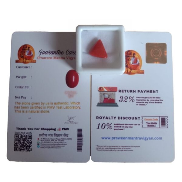 – The first benefit of the Triangle Red Coral/ Moonga stone is victory over enemies and adversaries. Since Mars is the god of warfare it gives the necessary courage to overcome obstacles and enemies and ensures victory for the individual.